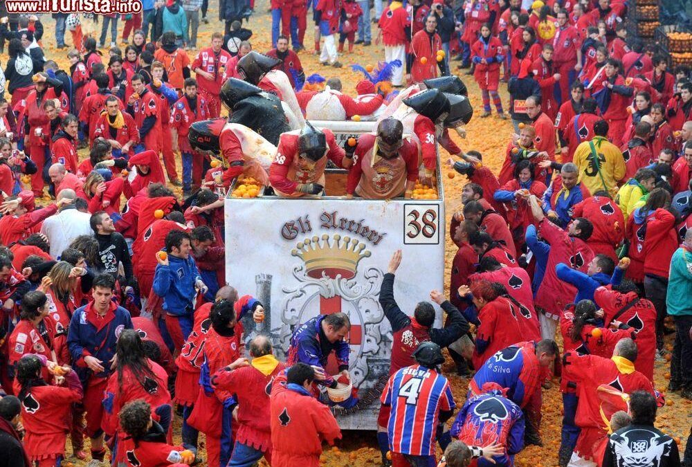 La Battaglia delle Arance rievoca la ribellione del popolo di Ivrea, rappresentato dagli aranceri a piedi, senza protezione, contro la tirannia feudale, simboleggiata dai tiratori sui carri, le cui protezioni richiamano le armature dei cavalieri di un tempo.