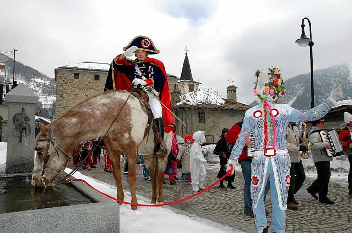 Unico comune denominatore gli spettacolari costumi, che per alcuni fanno riferimento al passaggio di Napoleone Bonaparte nel maggio del 1800, durante la sua discesa verso la pianura Padana, dovrebbe avrebbe incontrato gli austriaci a Marengo sconfiggendoli. Sarà il fascino del condottiero e le uniformi dei suoi soldati, ma questo vivo ricordo si è fissato sui costumi e le maschere di questo carnevale, che accende di colori il candido manto della neve invernale.