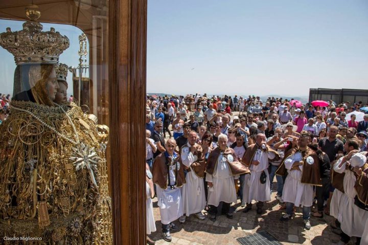 Al monte, la statua effettua tre giri attorno al santuario, poi tutti dentro per la Messa. Al termine i devoti si spargono sui prati per grandi picnic all’aperto; vale la pena unirsi a loro, e prendersi così anche il tempo di ammirare uno dei panorami più ampi di tutto il Mezzogiorno: a ovest uno spicchio di Tirreno, a nord-est un lungo tratto di Adriatico, mentre in lontananza si riconoscono, oltre Matera, le alture delle Murge su cui si erge Castel del Monte. La statua verrà poi riportata in paese, con un pellegrinaggio al contrario, la seconda domenica di settembre.