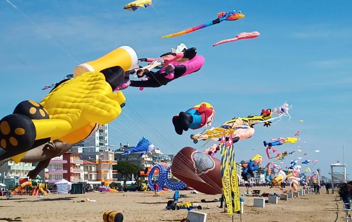 Anche questa primavera il cielo di Jesolo si tinge di mille colori. L’appuntamento è dal 5 al 7 aprile 2024, quando la cittadina ospita una nuova edizione dello Jesolo Beach & Kite Festival, ovvero il 3° Festival Internazionale degli Aquiloni. Vi partecipano 200 aquilonisti professionisti e quasi un centinaio di appassionati provenienti da tutto il mondo, confermandosi tra le più grandi e importanti kermesse di questo genere in Italia.