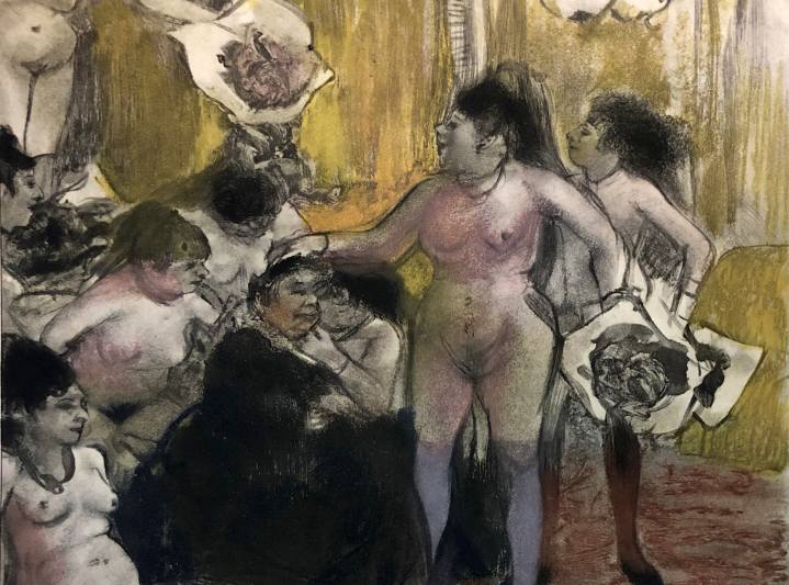 I due aspetti contrastanti della sua vita parigina emergono in maniera esemplare dalle immagini e dagli studi fatti dal vivo, con una particolare attenzione alla forma e al segno. Accanto alla produzione di disegni e incisioni dell’artista – come dalle serie La maison Tellier e La Famille Cardinal e, in facsimile, dal Carnet di disegni per Ludovic Halévy – spiccano altri celebri artisti tra cui Pablo Picasso (acquaforte Degas e Desboutin, serie La Celestine) e Jules Pascin (disegni a inchiostro Maison Close).