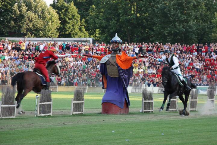 Al centro del campo c'è il Niballo, che raffigura l’odiato nemico saraceno con alle estremità delle braccia un dischetto in metallo del diametro di 8 cm. Ai lati del campo i due contendenti che sfidandosi a singolar tenzone lanciano il cavallo al galoppo e cercano di colpire per primi il bersaglio con la lancia. Tutti sfidano tutti e a ogni disfida il vincitore conquista uno scudo.