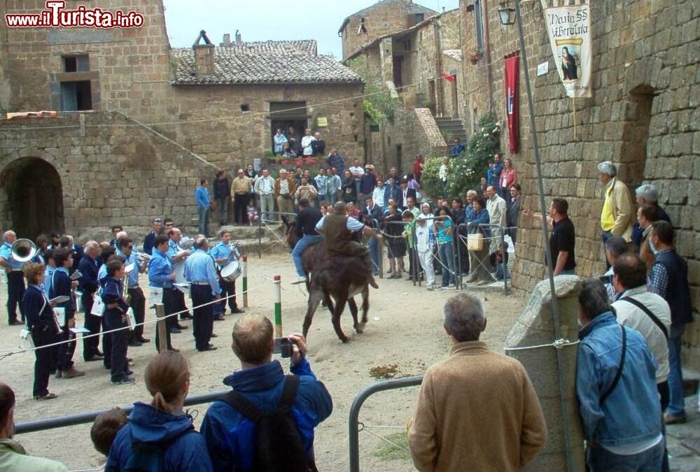 Il Palio della Tonna è il retaggio di un’epoca – neppure poi così lontana – in cui gli asini erano l’unico mezzo di trasporto capace di inerpicarsi fino al paese, lungo gli sterrati che risalgono fino alla cima della rupe su cui è costruito. Si consumano in breve i tre giri della piazza, ma nell’arco della giornata altre prove di destrezza, sempre a dorso d’asino, fanno da contorno alla sfida.