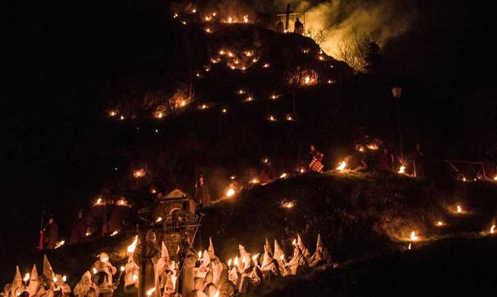 Lungo il percorso che va dalla Chiesa della Misericordia al Monastero delle Suore Agostiniane va serpeggiando in lenta sfilata una scia di fuochi e fiaccole impugnate dai partecipanti, soldati romani, donne pie, il Cireneo e, naturalmente, Gesù Cristo portatore della pesante Croce.