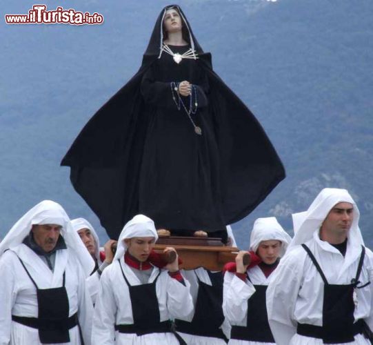 Un uomo con le vesti della confraternita dell'Addolorata fa voto di portare la croce penitenziale: verso le undici il penitente inizia il suo percorso con la croce in spalla. Gli altri penitenti lo seguono ma presto la processione prende un ritmo frenetico: a causarlo sono le donne che hanno avuto, tra il venerdì santo e quello dell’anno precedente, lutti in famiglia. Esse portano un lume a olio e seguono la croce, ma tale lume va deposto in una fossa davanti alla scalinata della Basilica prima che la croce venga sollevata.