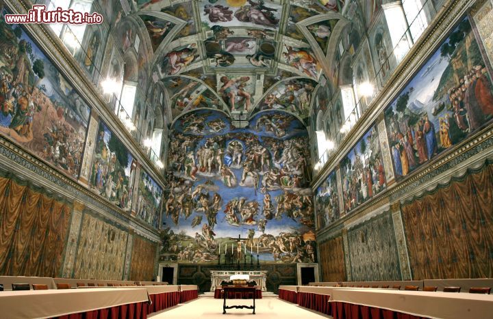 Facendo uno sforzo di immaginazione, dobbiamo infatti andare a cancellare (ovviamente virtualmente) tutta la decorazione della volta con gli affreschi di Michelangelo Buonarroti: al loro posto si stendeva un elegante cielo stellato d’oro su sfondo blu dipinto da Piermatteo d’Amelia, seguendo quella che era la moda del tempo. E naturalmente non c’era neppure lo straordinario Giudizio Universale dipinto da Michelangelo sulla parete dietro l’altare. Al posto vi erano, invece, due grandi finestre che completavano il giro con quelle presenti sulle pareti laterali. Ma non immaginiamoci una Cappella Sistina priva di pitture o colori: papa Sisto IV infatti chiamò per la sua decorazione gli artisti più famosi del tempo, tra i quali per esempio meritano particolar menzione il Botticelli, il Perugino e il Pinturicchio. Essi ornarono le pareti laterali, divise in tre fasce orizzontali: nella parte inferiore furono realizzati ad affresco finti drappi damascati con le insegne del pontefice e sopra di essi venivano appesi gli arazzi eseguiti su disegni di Raffaello; nella fascia mediana, la più importante, furono dipinte scene di Storie Bibliche con episodi della vita di Mosè e di Cristo (che oggi troviamo quindi disposte lungo tre delle quattro pareti); in quella superiore, all’altezza delle finestre, furono fatti realizzare da Sisto IV, i ritratti dei primi pontefici, per dimostrare la continuità del suo mandato con i suoi predecessori.