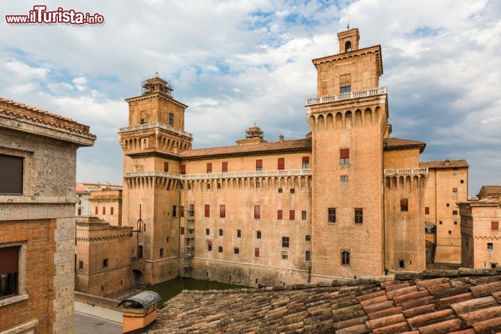 A commissionare l’opera fu Niccolò II d’Este che, nel maggio del 1385, incaricò Bartolino da Novara di costruire un apparato difensivo il cui aspetto ricalcasse quello del poco distante castello di Mantova, progettato dallo stesso architetto piemontese. La fortificazione sorse inglobando un’antica preesistenza duecentesca, la Torre dei Leoni, a fianco della quale sorsero altri tre torrioni angolari a pianta quadrata: Marchesana, San Paolo e Santa Caterina. Quadrato è anche il cortile interno all’edificio, protetto da innovativi apparati tecnologici difensivi quali rivellini e ponti levatoi che lasciano trasparire il terrore con cui Niccolò II intraprese la costruzione dell’opera. Malgrado l’originario carattere spiccatamente difensivo, il castello perse rapidamente la propria connotazione, subendo a partire dalla seconda metà del Quattrocento numerosi interventi di restauro tesi alla sua progressiva trasformazione in palazzo nobiliare. A questa categoria si ascrivono lavori operati da artisti del calibro di Raffaello, Giovanni Bellini e Tiziano per conto di Ercole I, della moglie Eleonora d’Aragona e dei loro successori prima che, nel 1597, con la morte dell’ultimo erede degli Estensi, Alfonso II, il castello passasse sotto il controllo del papato chiudendo di fatto la sua fase di maggior splendore.