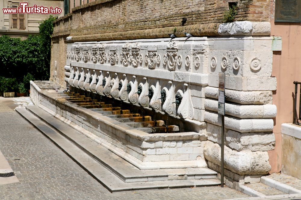 Costruita nel 1561 su disegno dell’architetto Pellegrino Tibaldi, la fontana riprende e risistema una bocca d’acqua già inglobata nelle mura in epoca medioevale. Ad oggi, si ritiene che i tredici mascheroni rappresentino le 13 antiche corporazioni della città mentre, a livello simbolico, satiri e fauni rappresentano le forze selvagge della natura acquitrinosa, un tempo presenti in zona, sormontati simbolicamente dal bassorilievo del Cavaliere all’assalto (lo stemma è posto aldisopra della maschera centrale in pietra), effigie della trionfante città di Ancona, che li sovrasta.