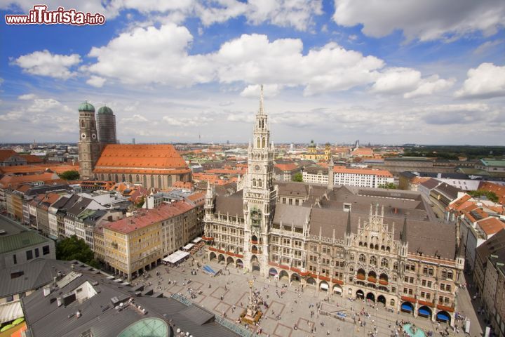 La piazza, che ruota attorno al perno della colonna barocca in marmo della Mariensaule dedicata anch’essa alla vergine patrona della Baviera (eretta nel 1638 per commemorare la fine dell’invasione svedese), è qualificata da presenze contrastanti: il quattrocentesco vecchio municipio (Altes Rathaus), parzialmente ricostruito dopo la guerra; la gran mole neogotica (1867-1908) del nuovo municipio, il Neues Rathaus, con il famosissimo orologio carillon a figure che si animano allo scoccare delle 11; la Peterskirche, la più antica di Monaco (XII° secolo) più volte rimaneggiata con la svettante torre di facciata (XIV° secolo) e il sontuoso interno barocco.