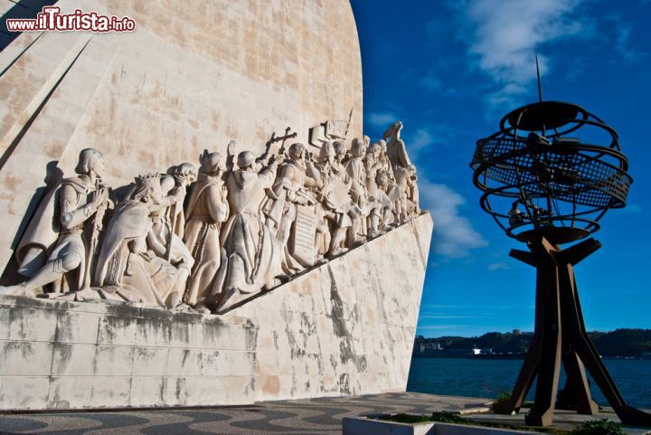 La colossale struttura, che per il posizionamento e la resa artistica esprime davvero la sensazione di qualcosa in procinto di salpare da un momento all'altro per il mare, è spettacolarmente piazzata sulla riva settentrionale del fiume Tago, a fianco della marina di Belém, del Centro Nautico Algés e Dafundo e del Museo dell'Arte Popolare. Ha la forma di una prua stilizzata di una caravella con tre grandi vele che sorgono a fianco di un blocco centrale verticale, decorato su entrambi i lati con bassorilievi raffiguranti la bandiera di Joao I. Enrico il Navigatore guida le due file di protagonisti di quell'epopea, che si sviluppano ai lati della struttura. In tutto ci sono 33 statue che raffigurano non solo navigatori celeberrimi come Ferdinando Magellano e Vasco da Gama, ma anche re, principi, esploratori di minor fama, cartografi, scrittori, pittori, matematici e missionari. L'ispirazione stilistica è stata tratta dai polittici intrisi di realismo fiammingo del pittore Nuno Gonçalves e dall'austero classicismo del monumento a Gonçalves Zarco, realizzato dallo scultore Francisco Franco nel 1927 e posizionato nel centro di Funchal, da cui Leopoldo de Almeida non si distaccò, dando inizio, secondo un critico, al “periodo d'oro della scultura portoghese”.