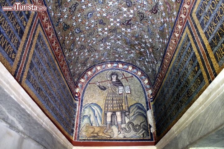Rifatta completamente ad affresco all’inizio del Novecento è la volta del piccolo catino absidale caratterizzato da un cielo stellato che imita quello suggestivo del Mausoleo di Galla Placidia.