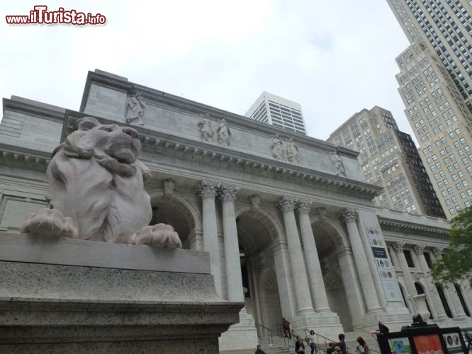 Ogni anno circa 16 milioni di persone varcano l’ingresso della biblioteca di NYC. Prima di entrare nella sede centrale ammirano la facciata di marmo bianco, in elegante stile Beaux Arts: ai lati dell’entrata ci sono le sculture di Frederick MacMonnies, che rappresentano un uomo seduto su una sfinge, simbolo della verità, e una donna seduta su Pegaso, simbolo della bellezza; nel frontone ci sono le statue di Paul Bartlett, che da sinistra a destra simboleggiano la filosofia, il romanzo, la religione, la poesia, il dramma e la storia.