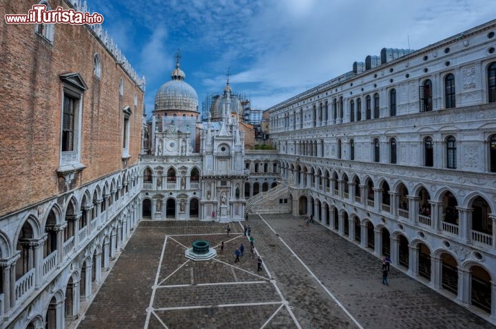 La Porta della Carta, ingresso principale della dimora, conduce al cortile di grandi dimensioni racchiuso dalle facciate interne dell’edificio ricche di elementi decorativi gotici, rinascimentali e classicheggianti. Sul lato nord del cortile si trova il porticato Foscari con l’omonimo arco, costruzione in stile gotico veneziano a cui sono stati sapientemente abbinati elementi di impronta rinascimentale. Se di fronte all’arco Foscari troneggia la Scala dei Giganti con le due imponenti statue di Nettuno e di Marte, opera del Sansovino, sopra il porticato si innalza la Facciata dell’Orologio realizzata dal Monopola.