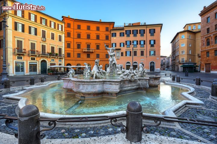 I quattro fiumi – Nilo, Gange, Danubio e Rio della Plata – ritratti come imponenti e nerboruti giganti, secondo il modello classico, rappresentano i quattro continenti allora conosciuti, caratterizzati anche dalla raffigurazione della tipica flora e fauna, accompagnata anche da altri animali fantastici, quali ad esempio il drago di mare. La vasca, così come la struttura portante, è stata modellata come un fondale e un paesaggio marino, sovrastato dal grande obelisco domizianeo, su cui è stata posta una colomba in bronzo, simbolo della famiglia Pamphilij, che dall’alto e per grazia divina illumina tutta la fontana e dunque simbolicamente il mondo intero. Mille e più leggende e storie divertenti circondano questa fontana, rendendola una delle più note al mondo. Anche la Fontana del Moro, così chiamata per il barbuto uomo posto al centro, assai più dimessa rispetto alla precedente, è opera autografa del Bernini.