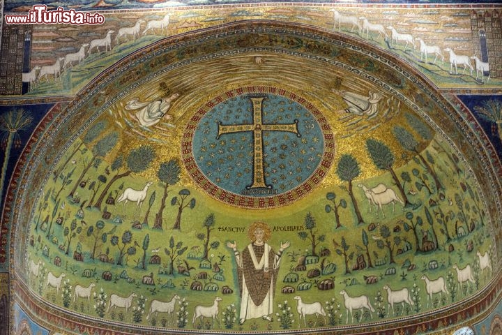Fra le decorazioni musive più interessanti ci sono quelle del catino absidale e dell’arco trionfale, il primo realizzato poco prima della metà del VI° secolo e il secondo fra il VI° e il XII° secolo. I mosaici dell’abside si articolano in due zone con in alto una grandiosa scena di Trasfigurazione con un grande disco gemmato con una croce tempestata di pietre preziose su un fondo azzurro cielo impreziosito da 99 stelle d’oro e d’argento. All’incrocio dei bracci della croce c’è il volto di Cristo con le lettere alpha e omega, prima e ultima dell’alfabeto greco e simbolo stesso del Padre. La parte inferiore dell’abside si presenta invece con l’immagine di Apollinare, fondatore e primo vescovo della chiesa ravennate con sotto ai suoi piedi dodici agnelli a rappresentare i fedeli.