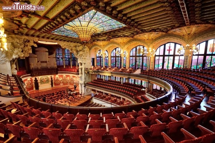 Ma il vero tesoro è all’interno. Per accedere al foyer si utilizza l’entrata laterale, e salendo una sontuosa scalinata si accede al primo piano e al vero e proprio auditorium. Qui ci si rende conto dell’eccezionalità del teatro: dimenticate la penombra dei teatri tradizionali, appesantiti da velluti scuri, perché l’auditorium del Palau de la Música Catalana è illuminato dalla luce del sole, che filtra direttamente dalle pareti di vetro. Vetro, cristallo e acciaio sono ampiamente utilizzati in questo “giardino della musica”, concepito come spazio aperto dove si può fare a meno della luce artificiale. Al centro del soffitto, come un enorme gioiello, c’è una copertura di vetro multicolore di inconfondibile gusto Art Nouveau: un capolavoro unico che ha un po’ del lampadario di cristallo, un po’ del mosaico, un po’ della vetrata policroma di una cattedrale.