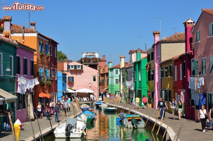 Circondata da specchi lacustri come la palude di Santa Caterina e quella di Burano, accarezzata dal canale dei Borgognoni, la cittadella è collegata a Murano tramite il percorso navigabile Bisatto-Canale Carbonera-Scomenzera San Giacomo. Guadagnata la sponda di Burano, ci si immerge nel piccolo centro e subito ci si accorge di aver a che fare con una sorta di opera d’arte galleggiante, un dipinto a cielo aperto incorniciato dal’acqua: come pennellate arlecchinesche e campiture bizzarre, le case se ne stanno allineate con i loro colori squillanti, contrastanti con la foschia o ancor più luminosi nelle giornate di sole.