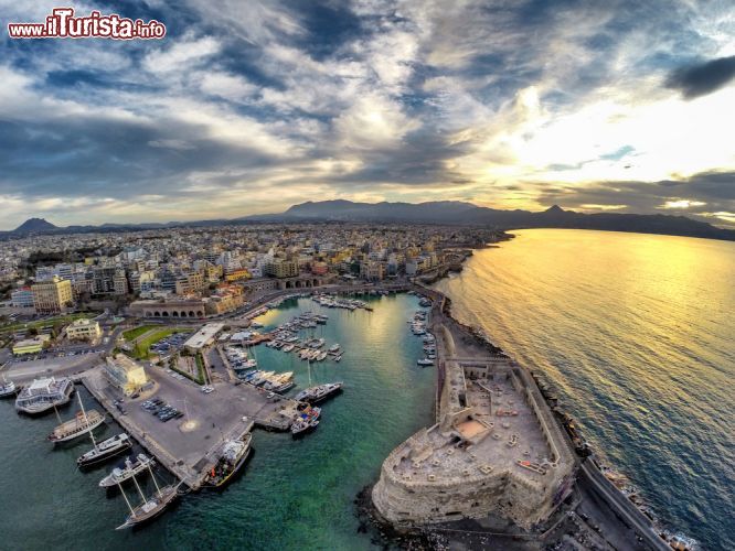 La zona più antica, parlando del centro, si sviluppa attorno al porto dominato dall'antica fortezza veneziana, chiamata Rocca al Mare e poi trasformata, sotto l'influsso del dominio turco, in Koules, nome con il quale è nota tutt'ora. Il suo utilizzo era difensivo da un lato e coercitivo dall'altro, come sede delle carceri. Dalla fortezza parte la grande cinta muraria, completata da fossati, le cosiddette mura veneziane, costruite a difesa della città e considerate fra più lunghe d'Europa. Gli spazi che un tempo ospitavano le barche in riparazione sono stati trasformati in seguito in arsali per armi e polvere da sparo. Guardando nella direzione del mare, dall'alto dei bastioni della fortezza, è possibile vedere l'isola di Dia, ora disabitata ma un tempo, negli anni 2700-1450 a.C, sede di un antico insediamento minoico individuato da Jacques Cousteau durante una delle sue innumerevoli immersioni. Restando in tema, a 5 chilometri da Heraklion si trova il sito archeologico di Cnosso centro e capitale della civiltà minoica. I resti delineano i contorni del palazzo-città di Minosse nel cui labirinto si consumò il viaggio di Teseo alla ricerca del Minotauro.