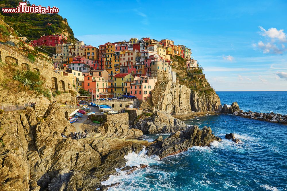 La piccola Manarola (seconda solo a Corniglia) è splendida dal mare, il suo porto naturale rimane difeso a oriente ed occidente da due speroni rocciosi, mentre le tipiche casette colorate a torre in stile ligure si affastellano alla foce del torrente Groppo. Più in alto i verdi terrazzamenti disegnano soavi geometrie, che si stringono al borgo, come serrate dal turchese del cielo e dal cobalto del mare.