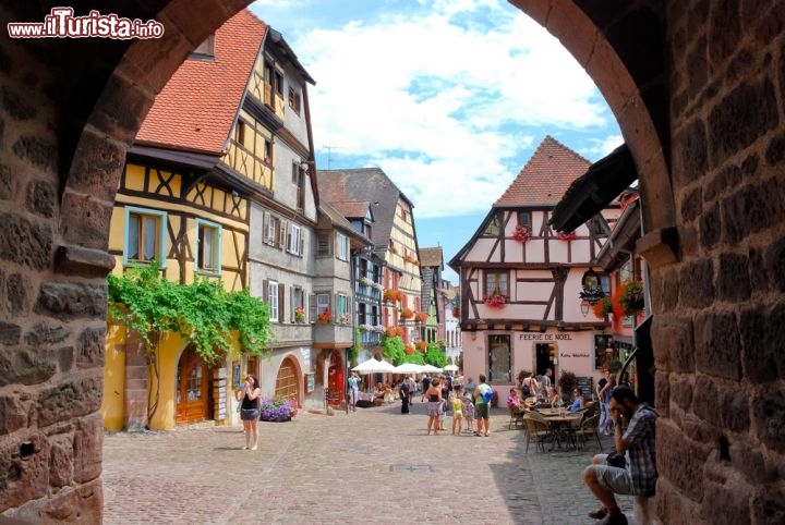 Una doppia cerchia muraria, porte austere e torri massicce, degne di una fiaba cavalleresca, ci danno l’idea che il piccolo borgo alsaziano di Riquewihr (in francese Riquevire) sia un gioiello che merita di essere protetto. Se un tempo le fortificazioni servivano da difesa contro gli attacchi nemici, oggi lo scrigno antico delle mura fa da spartiacque tra il sogno e la realtà, come ad avvertire i visitatori che stanno per addentrarsi in un mondo magico. E in effetti l’atmosfera che si respira in questo lembo orientale della Francia, nel dipartimento dell’Alto Reno, sa inebriare i sensi e stuzzicare l’immaginazione, risvegliando emozioni dimenticate.