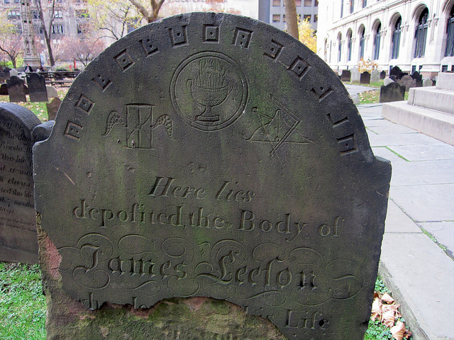 La tomba di James Leeson, sepolto nel cimitero della Trinity Church, contiene un mistero. O perlomeno lo ha contenuto fino a quando è stata identificata la chiave che ha permesso di risolvere l'enigma. La tomba di Neeson, morto alla fine del 1700 è vicino al Monumento al Soldato in fondo al lato Nord. Fra una clessidra alata e alcuni simboli massonici, sull'orlo della lapide, a seguire la curvatura naturale della pietra, ci sono una serie di piccoli quadrati, alcuni chiusi, altri aperti, contenenti dei puntini, a volte uno, a volte due, a volte nessuno. Quando venne identificata la chiave di lettura corrispondente al codice cifrato "Freemason" si scoprì che la scritta significava "Ricorda la morte". Una delusione per coloro che fino ad allora avevano aspirato a più complessi significati anche se un mistero è sicuramente rimasto e tale rimarrà: a chi era diretta questa frase il cui contenuto poteva tranquillamente essere esposto senza enigmi? Ad un amore segreto o a chi avrebbe potuto trovare, seguendo quelle indicazioni, un tesoro? Il cimitero si trova al 74 di Trinity Place fra la Broadway e Wall Street. E' aperto tutti i giorni dalle 7 alle 18, il sabato dalle 8 alle 16 e la domenica dalle 7 alle 16. Per raggiungerlo, linea 1, N e R fino a Rector Street oppure 4 e 5 fino a Wall Street.