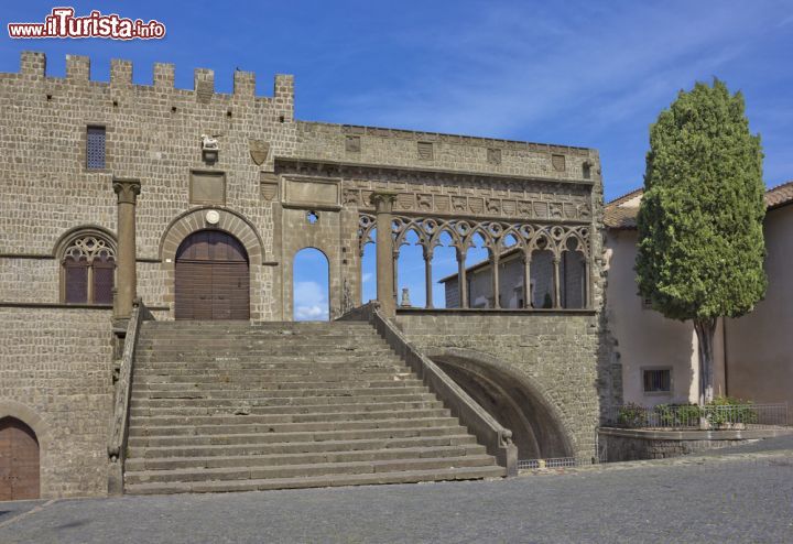 Viterbo si stringe nell'abbraccio delle mura castellane, con il quartiere medievale, la cattedrale di San Lorenzo e il magnifico Palazzo dei Papi: la città fu infatti sede papale nel XIII secolo e vide succedersi ben sei pontefici. La facciata austera di nuda pietra si prolunga in una loggia leggera, mentre la massiccia scala centrale conduce al Salone del Conclave.