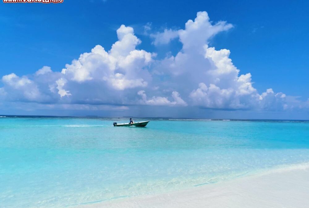 26 atolli distesi per una lunghezza di circa 800 chilometri a pochi passi dall’Equatore, in pieno Oceano Indiano; una teoria senza fine di isole che emergono dal mare, più o meno antropizzate e disegnate dai colori della natura, il verde delle palme, il bianco abbacinante della sabbia così fine da sembrare farina, e il turchese dell’acqua che ne orla i profili e degrada nel blu cobalto quando il reef finisce. Per immaginarlo come un vero paradiso naturale ci si mette lo spazio di un secondo, è sufficiente guardare dall’oblò dell’aereo in arrivo a Malé.
