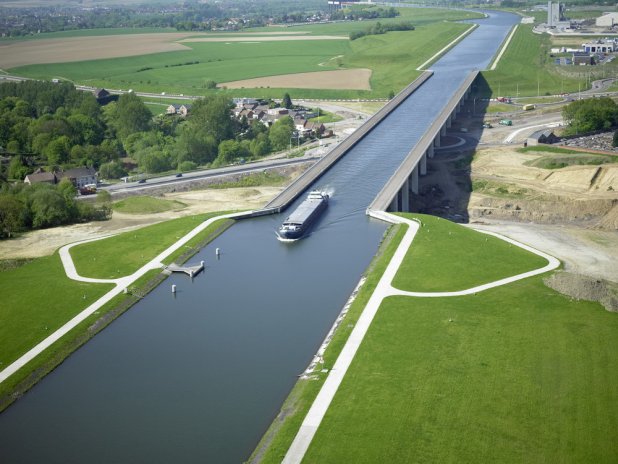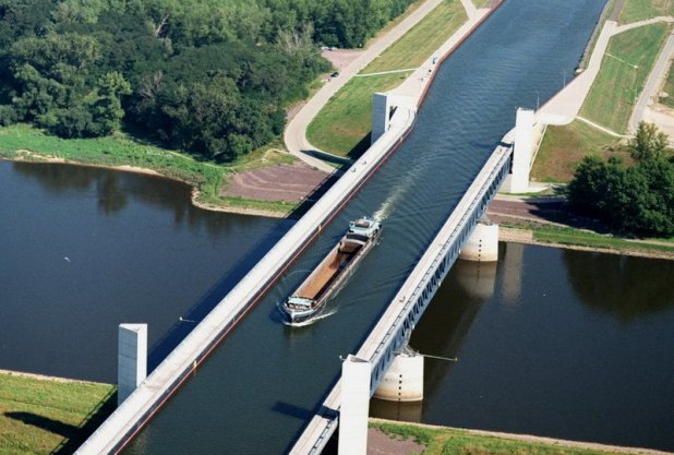 Ma dove si trova l’acquedotto navigabile più lungo del mondo? Ebbene, signore e signori, il primato va alla Germania, precisamente al Kanalbrücke Magdeburg che passa al di sopra del fiume Elba a breve distanza da Magdeburgo. Ai tedeschi ci sono voluti oltre 80 anni di lavori, tra progetti, ripensamenti e riprese: nel 1919 si cominciava a parlare dell’acquedotto e nel 1938 tutto sembrava procedere, ma durante la seconda guerra mondiale i lavori si interruppero per ovvi motivi. Solo con la riunificazione della Germania, vista la crescente esigenza di canali, il progetto dell’acquedotto tornò ad essere una priorità: dal 1997 ci sono voluti altri sei anni e 500 milioni di euro, ma il risultato è l’imponente struttura che vediamo oggi, che fu inaugurata nel 2003 e collega i due canali dell’ Elba-Havel e del Mittellandkanal. Il Kanalbrücke Magdeburg è un colosso alto 918 metri e largo 32, composto da 68 mila metri cubi di calcestruzzo e da 24 mila tonnellate d’acciaio che lo rendono adatto a trasportare in sicurezza anche carichi pesanti o pericolosi.