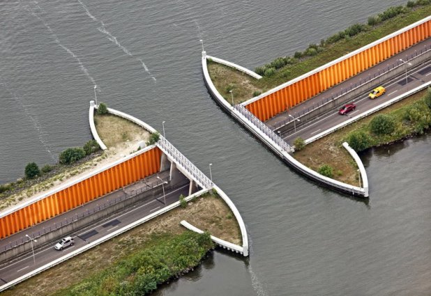 Un altro acquedotto olandese è quello di Veluwemeer, nei Paesi Bassi orientali: si trova vicino alla piccola città di Harderwijk, che a dire il vero non offre grandi attrazioni turistiche, ma il corso d’acqua sospeso è un affascinante striscia blu che collega la terraferma a Flevoland, una delle province in cui il paese è diviso nonché l’isola artificiale più estesa del mondo. L’acquedotto si trova lungo la strada statale N302, dove venne inaugurato nel 2002: 28 mila veicoli passano sotto il ponte ogni giorno, mentre al piano superiore, sul pelo dell’acqua, transitano imbarcazioni di vario genere cariche di merci. E' anche chiamato come "il ponte al contrario".