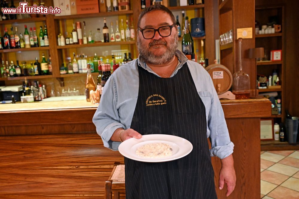 La famiglia Baù – Serafino, la moglie Michela e i figli Alberto, Giacomo e Matteo – è riuscita a trasmettere a chi siede ai tavoli della trattoria la passione per le cose buone e il buon bere, con progetti legati alle bollicine e al vino d’autore. Da assaggiare assolutamente sono il risotto con ventrigli e fiori d’arancia, la tagliata di petto d’anatra affinata al vino rosso e marmellata, la pasta al ragù d’anatra o al musso. E anche la pasticceria (opera di Michela) che ha aggiunto creatività ai dolci della tradizione.