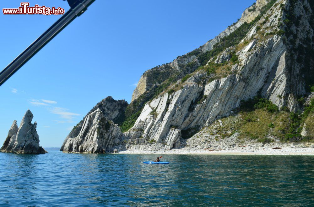 Dopo quest'excursus estemporaneo torniamo alla mini crociera sul Conero, affidati alla straripante simpatia e savoir faire di Capitano Antonio, che ha aperto per passione questa attività dopo oltre 30 anni da comandante di grandi pescherecci, una vita in mare e tanto da raccontare ai turisti curiosi. L'Honda 225 CV si accende, lasciamo il molo del porto di Numana e prendiamo la via del mare in direzione della Spiaggia del Frate, una delle spiagge più belle delle Marche, lingua di ghiaia fine incastonata tra la nuda roccia bianca e un fitto manto di flora. Di sabbia e sassolini si compone Spiaggia Urbani, piccola insenatura alle pendici di Sirolo segnata a sud da una grotta, un molo e un'alta rupe, e a nord da uno sperone roccioso. Stabilimenti balneari e segmenti liberi sono le note del suo spartito.