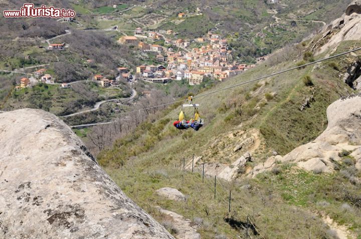 Non c'è un minuto di questa gita che non vi emozionerà. Qualsiasi cittadina scegliate come vostro punto di partenza e di lancio, entrambe sono opportunamente attrezzate, vi conquisterà con il suo centro storico, con gli scorci panoramici che vi offrirà mentre vi lascerete guidare lungo le vie scavate nella roccia, sulle quali troverete le botteghe artigiane che sanno raccontare mestieri antichi; quando vi sarete stancati di passeggiare nel primo borgo potete agganciarvi al cavo d’acciaio, lanciarvi nel vuoto e raggiungere l'altra cittadina, volando liberi per circa un chiometro e mezzo, a una velocità di 120 km/h, sospesi tra cielo e terra, direttamente immersi nell’incantevole panorama mozzafiato che c’è da queste parti.