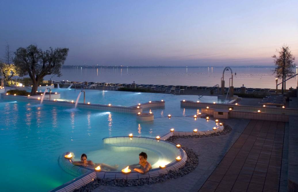Un susseguirsi di piscine interne ed esterne che vi propongono piacevolissima acqua calda e curativa, e vi assicuriamo che immergersi nella suggestiva piscina esterna, che affaccia direttamente sul Lago di Garda, mentre piove è qualcosa di entusiasmante, vasche idromassaggio, docce aromatiche e percorsi caldo/freddo che rivitalizzano e tonificano sia il corpo che l’umore.