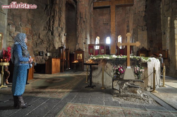 Decisamente più imponente è infatti la Cattedrale di Svetitskhoveli, anch'essa antichissima (4° secolo) ma di cui ammiriamo la versione medievale risalente all'XI secolo foto sopra). La sua fondazione si deve nuovamente a Santa Nino e il nome si lega proprio al momento della sua costruzione: deriva dall'unione delle parole Sveti => pilastro e Tskhoveli => vivifico, legate ad un evento miracoloso (levitazione) intercorso durante la posa in opera del primo pilastro da parte della santa. Da non perdere nei dintorni anche il monastero di Samtavro.