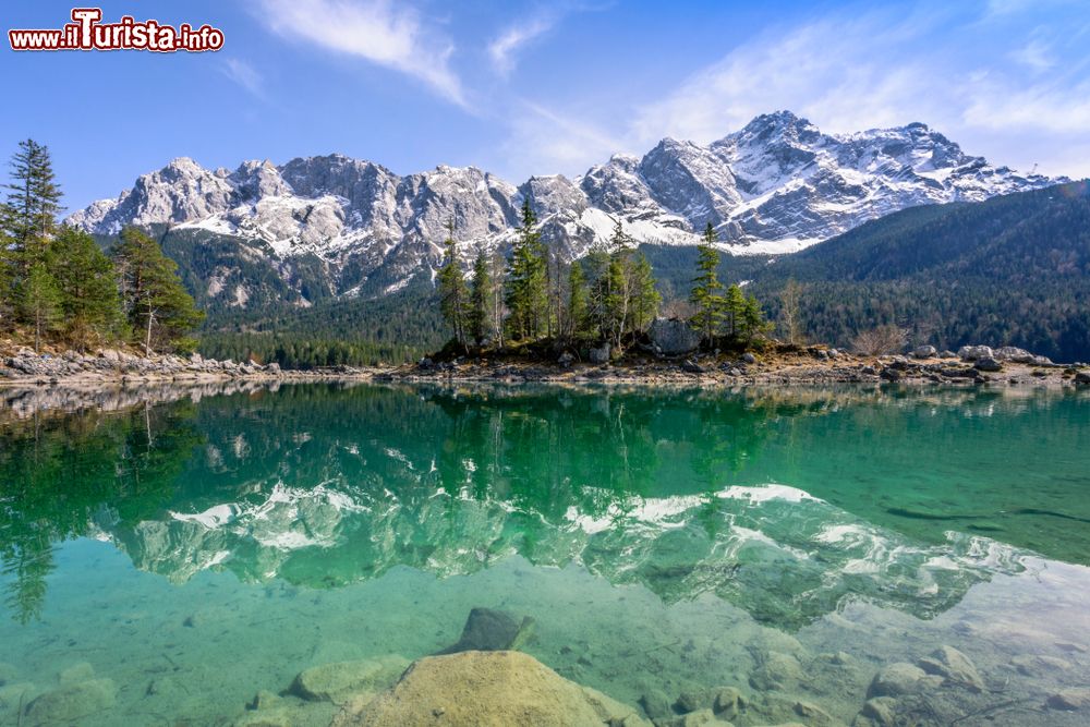 Il Lago Eibsee si trova in Baviera, circa 100 km a sud-ovest di Monaco, quasi sul confine con l’Austria, a un’altitudine di 973 metri s.l.m. alle pendici della Zugspite, la montagna più alta della Germania.