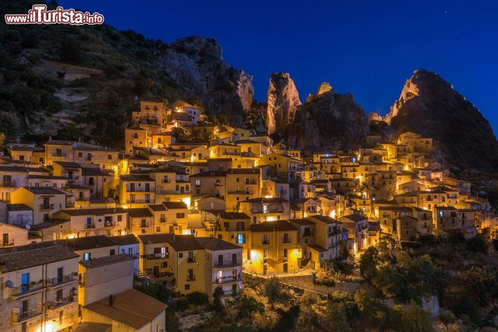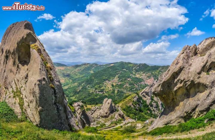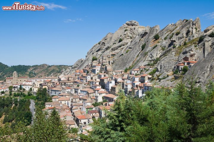 Salendo ancora lungo il percorso, si raggiunge Pietrapertosa simile, nella struttura, a Castelmezzano. L'abitato, incastonato e protetto dalle creste rocciose, si snoda lungo una sola via centrale. Per alcuni il fascino di Pietrapertosa è da comparare a quello di Petra, città simbolo della Giordania e dell'età dei Nabatei. Il percorso di circa 2 km che via terra la collega a Castelmezzano viene chiamato il "sentiero delle sette pietre", usato un tempo dai contadini. Il suo recupero ha permesso di restituire nuova vita ai racconti tramandati di generazione in generazione che hanno ispirato il libro "Vito ballava con le streghe" di Mimmo Sammartino.