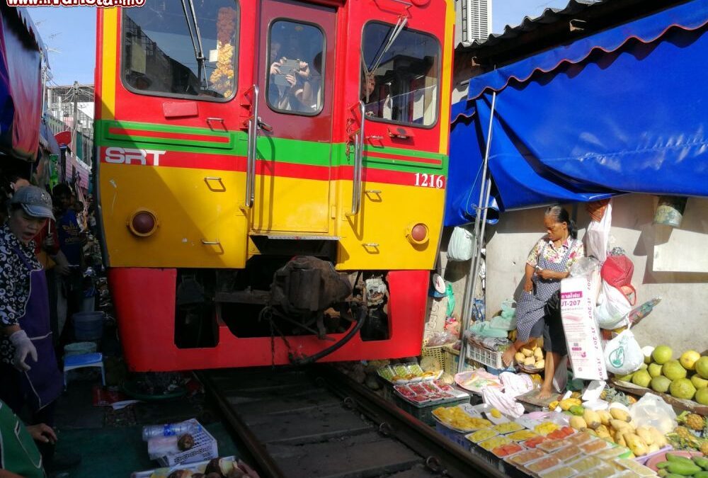 Siamo nella provincia di Samut Songkhram, nel sud della Thailandia, a poco più di una settantina di chilometri a sud ovest di Bangkok e più precisamente a Maeklong, un piccolo quartiere in cui si riversano ogni anno centinaia di visitatori diretti alla sua attrattiva principale, il mercato rionale. In lingua thailandese Talad Rom Hoop suona più o meno come “chiudere l’ombrello”, un nome che potrebbe sembrare strano ma che diventa improvvisamente chiaro al passaggio del treno.