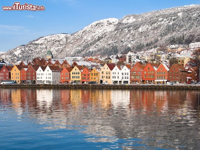 Bianco color neve, grigio colore della pioggia intensa che cala al calare delle tenebre e rosso color del Natale. Queste sono le tre combinazioni di colori che si amalgamano e giocano insieme in una danza di sfumature accese, intense e profonde, immerse in uno sfondo talvolta nero pece altre volte di un blu sfumato di rosso, per un sole che rimane timido nascosto tra le montagne ed un'oscurità che non vuole andar via. Questa è l'immensità e la magia natalizia della cittadina norvegese di Bergen, capitale dei fiordi che nasce dalle acque, da quel mare glaciale e profondo che è stata la culla della civiltà vichinga che qui ha scagliato tutta la sua potenza.