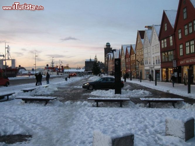 In qualunque periodo dell'anno voi visitiate Bergen, il cuore pulsante della città, sia per i turisti, sia per i suoi cittadini, è il quartiere anseatico del Bryggen, centro nevralgico della città sin dal tardo medioevo e ad oggi ricco di negozietti dal sapore tipico e ristoranti tradizionali. Una fitta schiera di case che se osservate da lontane, dal molo posto proprio di fronte, appaiono come un ammasso di abitazioni, ordinatamente allineate come soldati posti sull'attenti. In inverno quelle stesse case sono ricoperte da un manto bianco e soffice e danno quasi l'idea di traballare un po', schiacciate dal peso di una neve che cade fitta ed incessante soprattutto durante le ore notturne.