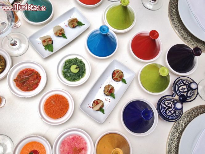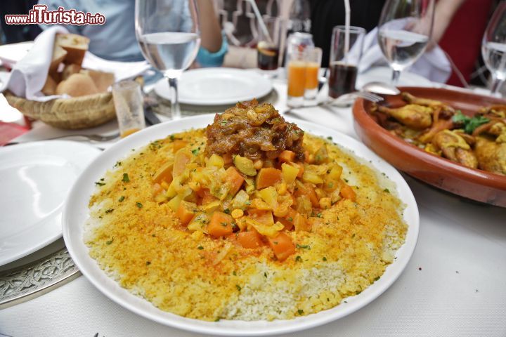 Eleganti antipasti serviti in piccole ciotole di ceramica colorate sono il tipico assaggio speziato e profumato per introdurre il piatto principale, un rigoroso couscous di verdure e carne, accompagnato da cipolle caramellate e uvetta e del pollo con olive, anch’esso speziato da curcuma e cannella.
