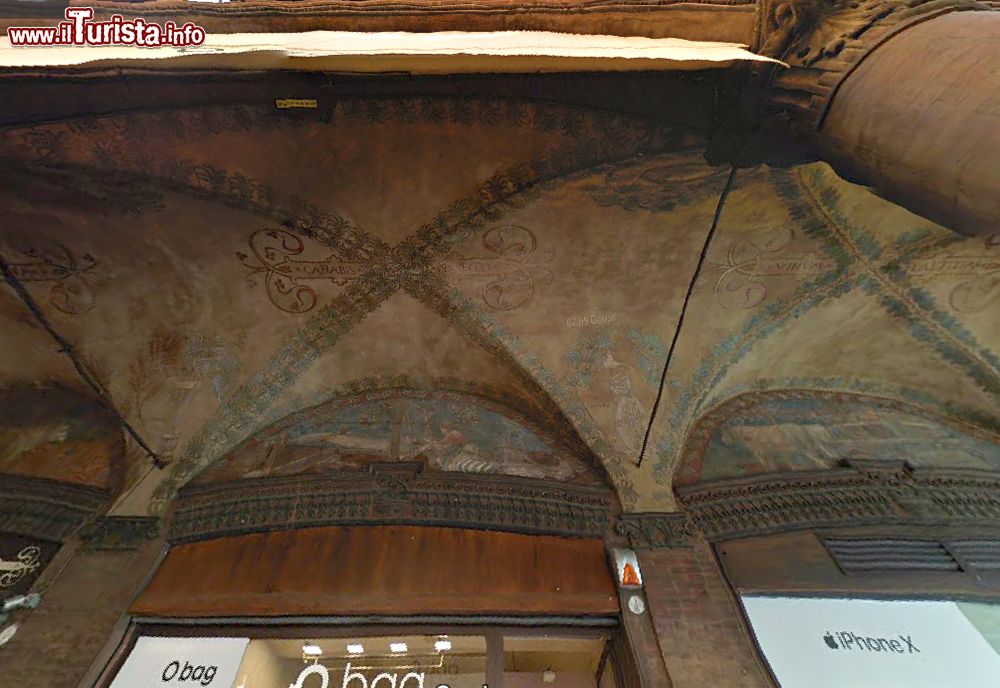 Imboccando la lunga via che porta verso il centro storico, via Indipendenza, arriviamo all’incrocio con via Rizzoli. Sul lato sinistro del portico, alzando lo sguardo verso gli affreschi che decorano il soffitto del portico scopriamo il secondo segreto. Anche chi è a digiuno di latino non potrà fare a meno di stupirsi leggendo i cartigli sopra la propria testa: tra un panis vita (il pane è vita) e un vinum laetitia (il vino è allegria) spunta un canabis protectio (la cannabis è protezione). Ci troviamo sotto la cosiddetta volta del Canton de’ Fiori della Casa Stagni, un edificio restaurato nel 1892 da Augusto Sezanne e affrescato con fiori e foglie di ispirazione quattrocentesca da Achille Casanova. Che cosa si intenda esattamente per “canabis protectio” rimane il vero segreto di questo luogo! L’ipotesi più diffusa vuole che quello della canapa fosse uno dei commerci più fiorenti a Bologna, e perciò sia stato citato in questo luogo assieme al pane e al vino.