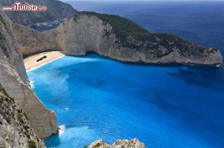 Questa non è una spiaggia: è un' icona, o se preferite una cartolina, una foto da giornale di viaggio. Un posto che potreste dire di avere già visto anche se non siete mai andati a Zante. Il motivo è che questa spiaggia posta sulla costa ovest (in pratica sul versante ionico), è uno dei luoghi più fotografati della Grecia. Per secoli si è chiamata Agios Georgios, ma deve il suo nuovo nome al naufragio di una nave nel 1983, che l'ha fatta diventare la spiaggia del Navagio, o del Naufragio, o ancora del Relitto. Il fatto che secondo le voci la nave trasportasse un carico di sigarette di contrabbando non rende il luogo meno magico.