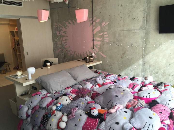 Gli esclusivi spazi dell'Hotel, disegnati dall'architetto Sean Knibb, sono un vero inno alla fantasia della gattina giapponese: dal dominio dei colori, rosa e lilla su tutti, fino alla carta da parati a trama Hello Kitty, niente è lasciato al caso. Le deliziose suite sono arredate con gusto e fantasia e curate in ogni dettaglio: i grandi letti sono coperti da biancheria soffice e da peluches, neanche a dirlo, alla tenera micina, gli ampi specchi ed i lampadari, per garantire luminosità alle stanze, sono decorati a tema.