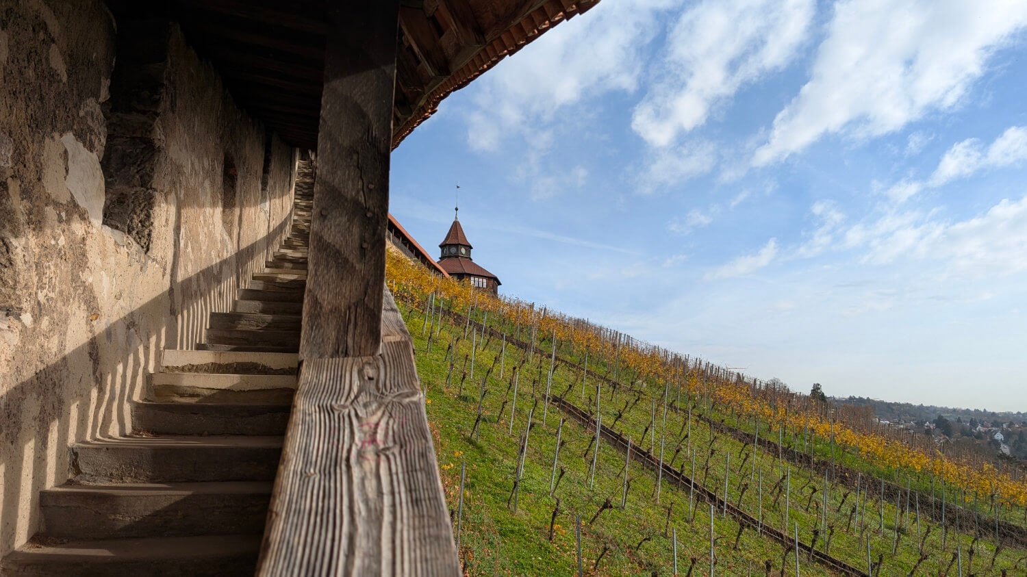 Per una vista mozzafiato sulla città e i vigneti tutt’intorno, il consiglio è quello di salire i 314 scalini che portano alla Dicker Turm, la “Torre Grossa” dell’Esslinger Burg.