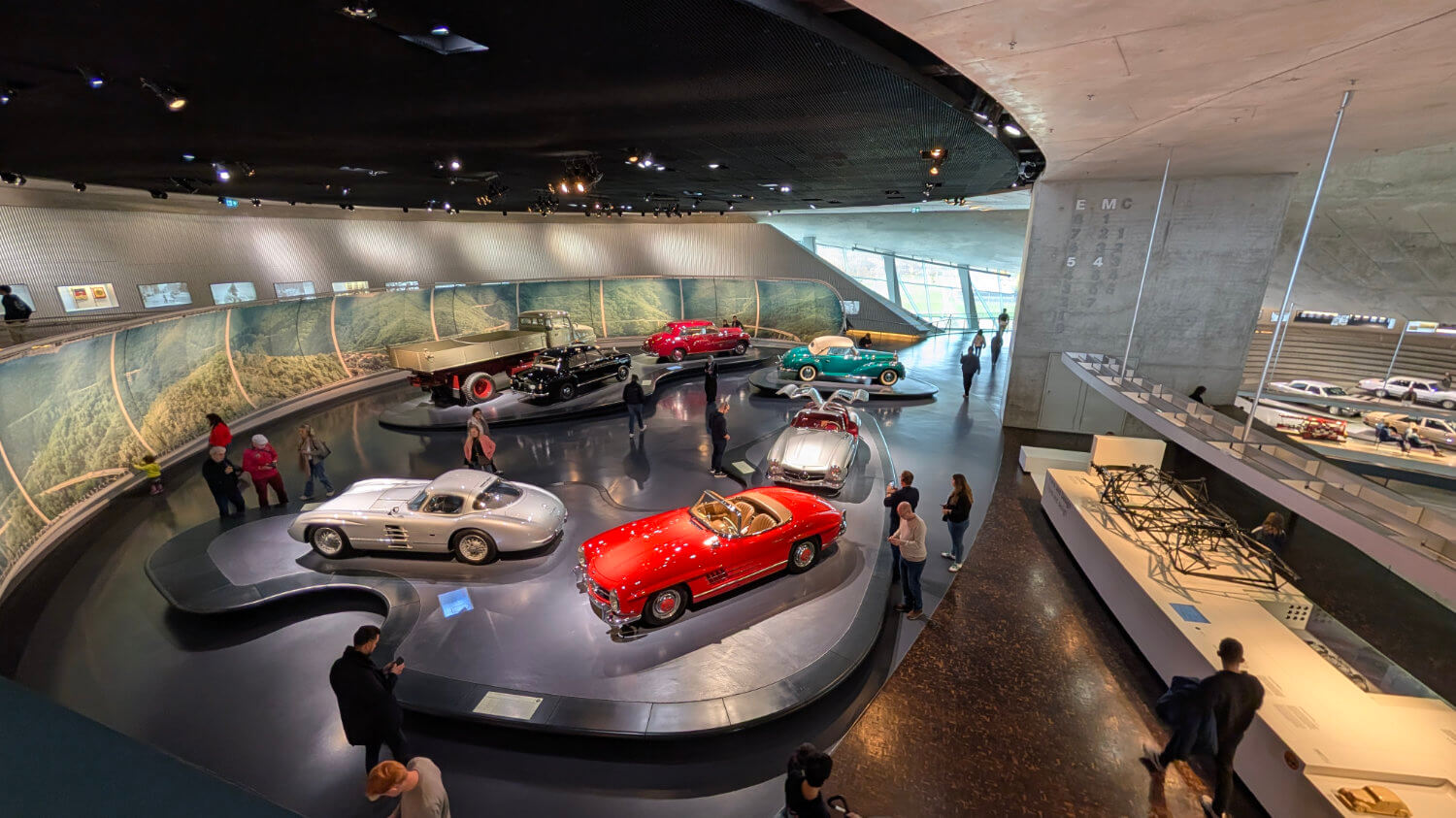 Il celebre Mercedes-Benz Museum, dalla suggestiva forma che ricorda una doppia elica, si sviluppa su nove livelli e due percorsi che si intrecciano. Quello cronologico è organizzato in sette sale e spiega le origini dell’automobile e l’evoluzione del marchio, inserendo la narrazione in un contesto più ampio che illustra la storia e i cambiamenti della società dal 1886 fino ai giorni nostri. In parallelo, il percorso “Collection” è più trasversale: cinque sale tematiche dove la collezione si apre su mondi diversi, non soltanto auto iconiche, ma anche veicoli legati al lavoro, ai viaggi, alla mobilità collettiva.