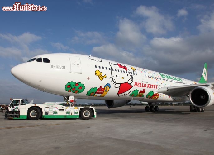 Ma non è finita qui, perché sempre a Taiwan la compagnia aerea locale, la Eva Airways, qualche tempo fa ha inaugurato non uno, non due ma ben tre aerei dedicati alla gattina: la sua immagine compare in bella vista sui velivoli, ma anche le poltrone e perfino i menu che vengono serviti a bordo hanno a che fare con Hello Kitty. Si tratta di tre Airbus 330: uno è l'apple jet, uno è il global jet e l'altro è il magic jet.