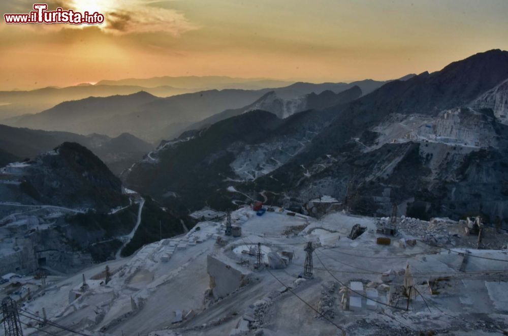 Il panorama che si apre mentre la jeep sale lungo i fianchi delle Alpi scolpite dalle cave di marmo è lunare. Le pareti, tanto bianche da abbagliare, segnate dalle tracce dell'estrazione dei blocchi che rivelano l'importante impronta lasciata dall'uomo accompagnano, ai lati, il passaggio dei mezzi. I percorsi sono continuamente modificati dai cantieri legati all'attività estrattiva, eseguita nelle 82 cave ricavate nella porzione delle Apuane collocata nella provincia di Carrara da una decina di aziende che fino ad ora ha intaccato il 6% del marmo disponibile.