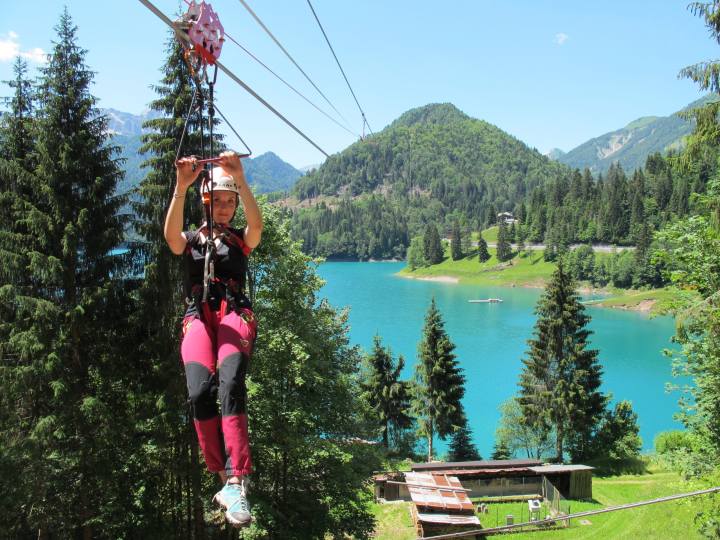 È tornata come ogni anno la stagione di apertura della zipline più lunga d’Europa a Sauris, in provincia di Udine. Tra i boschi del Monte Ruke ad attendere i visitatori c’è una scarica di adrenalina regalata da una serie di voli lunga 2,5 km, da affrontare sospesi a un cavo d’acciaio tra il verde della rigogliosa vegetazione delle montagne friulane e lo spettacolare panorama offerto dal Lago di Sauris.